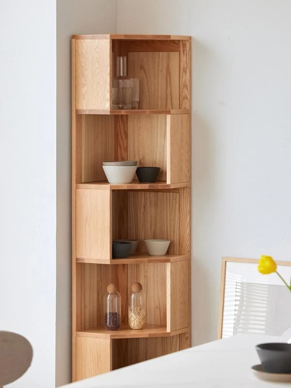 全実木の角スタンド棚!北欧オーク材使用の究極の収納ソリューション - リビングにぴったりな三角形の書棚&ディスプレイラックで、おしゃれにスッキリ演出!