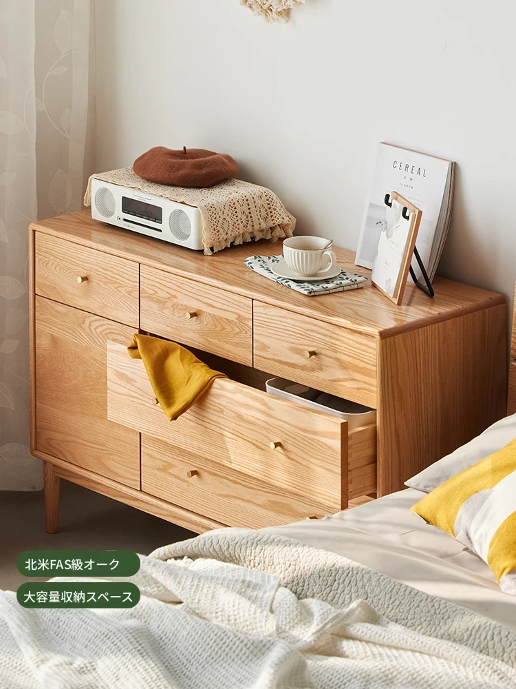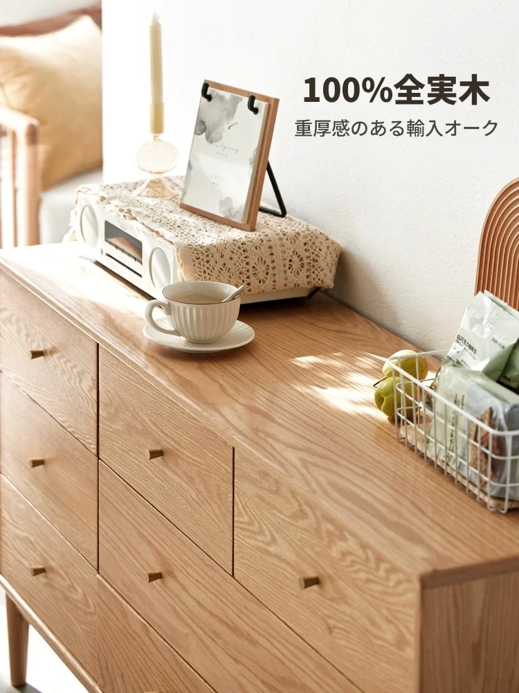 原木の贅沢、北欧風シンプルデザインの全木製七段チェスト。オーク材使用で耐久性抜群、寝室にぴったりの収納キャビネット。壁に寄せて使える省スペース設計で、スタイリッシュにお部屋を整頓!
