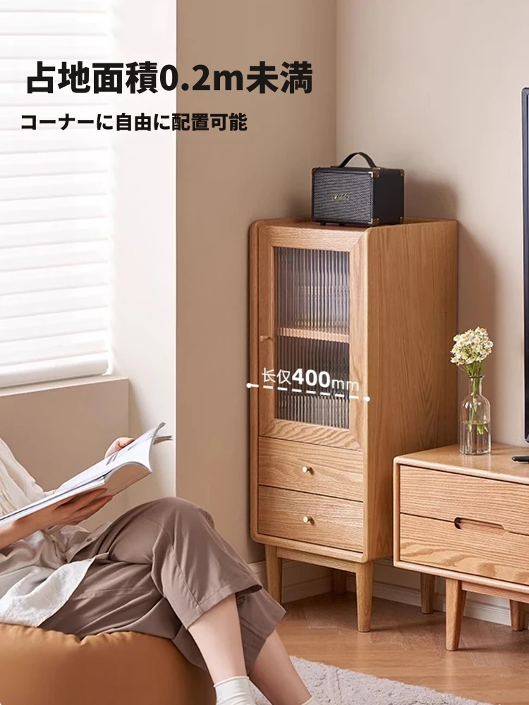 オーガニック無垢材使用のサイドキャビネット | 小型リビングに最適なオーク製ワインキャビネット | テレビや本の収納もできる多機能サイドボード | おしゃれな収納スペースを実現!