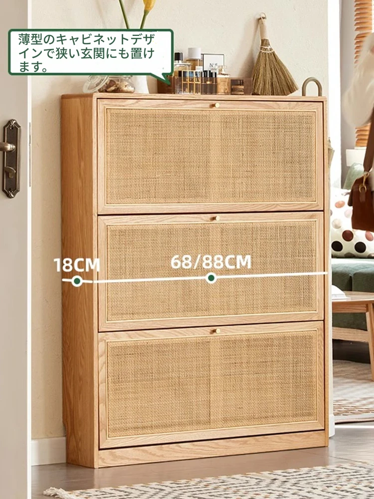 原材料にこだわった全木製シューズキャビネット♪ ラタン編みのスタイリッシュなデザイン!北欧のオーク材使用、モダンでシンプルな収納力抜群の玄関家具!おしゃれな空間を演出します。