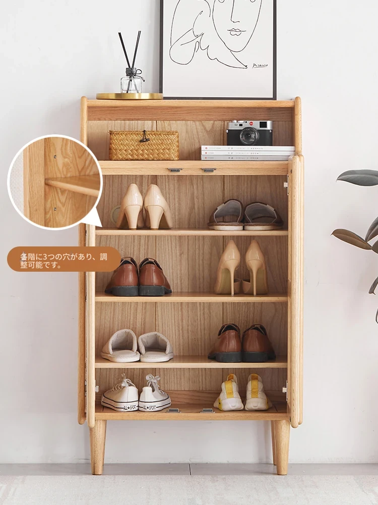 無垢木製シューズキャビネット - 家庭用の玄関収納、スリムデザインで壁寄せ可能!自然なオーク調、バスケット付きでスタイリッシュに収納。狭いスペースでも活躍する超薄型シューズラック!