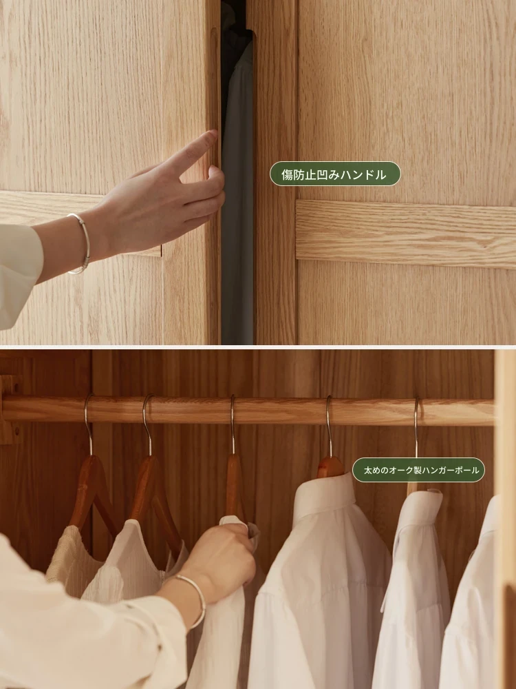 オーガニック全無垢材クローゼット|モダンでシンプルなデザイン|厳選したオーク材使用|ダブルドアで大容量収納|寝室にぴったりなハンガー付き衣類収納家具