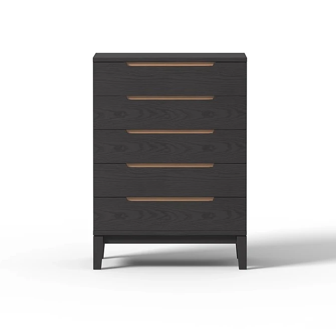 シンプルデザインの無垢材5段チェスト - おしゃれな寝室収納に最適!壁にぴったりフィットするドロワーキャビネット。ブラック&レッドオークの組み合わせで、あなたのお部屋をワンランクアップ。収納力抜群で、すっきり整理整頓できます!