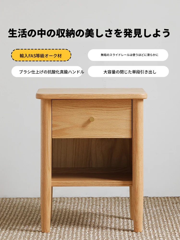 北欧スタイルのオーク材全木製サイドテーブル - コンパクトでシンプルなデザイン、収納力抜群の1段引き出し付き! 小さな寝室にも最適なナチュラルな雰囲気を演出します。
